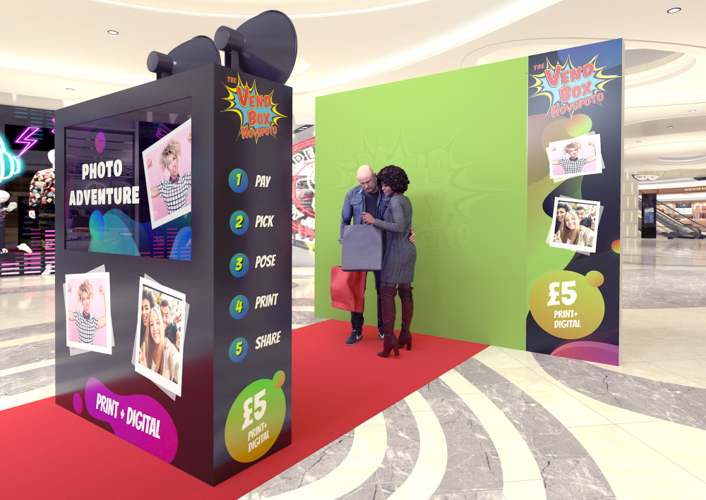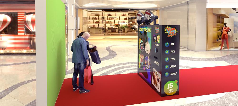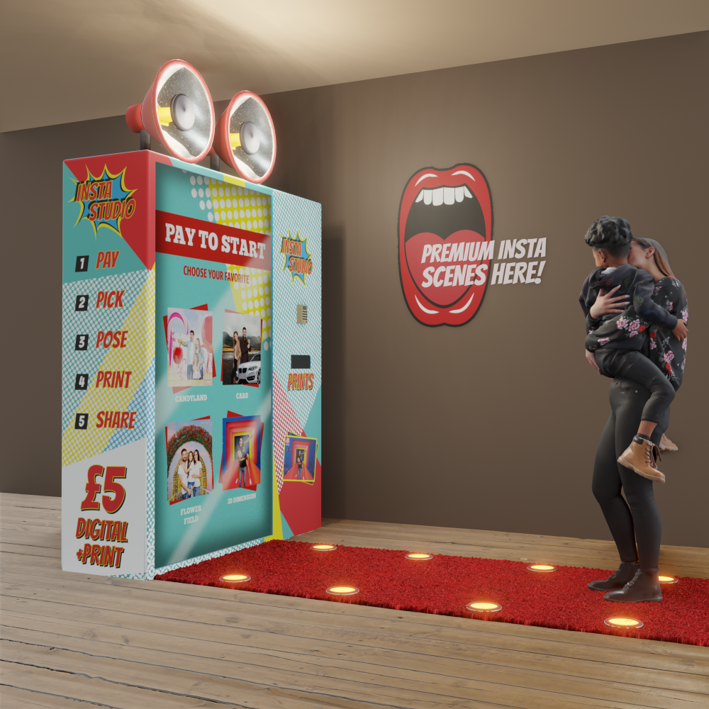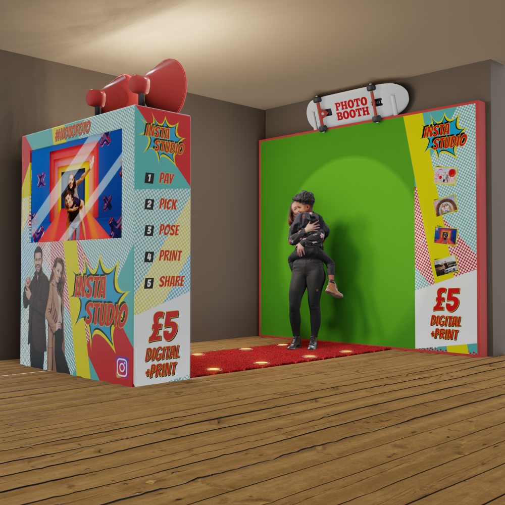 We can offer a high-end, interactive, self-service photo booth that shoots, shares, and prints photos in under a minute. However, this is no ordinary, run-of-the-mill photo kiosk. Using touch screen technology, the green screen enables customers to have their picture taken with well-known heroes and characters, incorporating the background of their choice.